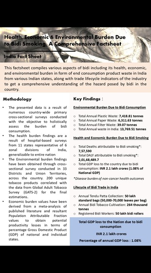 This factsheet compiles various aspects of bidi including its health, economic, and environmental burden in form of end consumption product waste in India from various Indian states, along with tra..
